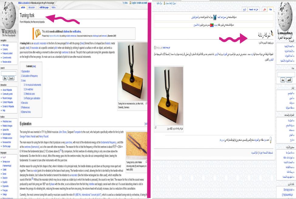 الصورة تحتوى على مقارنة للبحث عن (الشوكة الرنانة) فى الويكيبديا عربى وانجليزى لو كبرت الصورة هتعرف الفرق.