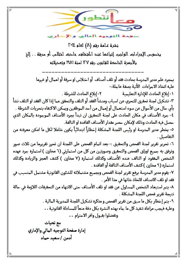 نشرات تصدرها صفحة التوجيه المالي والإداري على الفيس بوك نشرة عــامة رقم (8) لعام 2014 بخصوص الإجراءات الواجب إتباعها عند اكتشاف حادث اختلاس أو سرقة . . إلخ 127 لسنة 1981 وتعديلاته الملف المرفق 112038 |