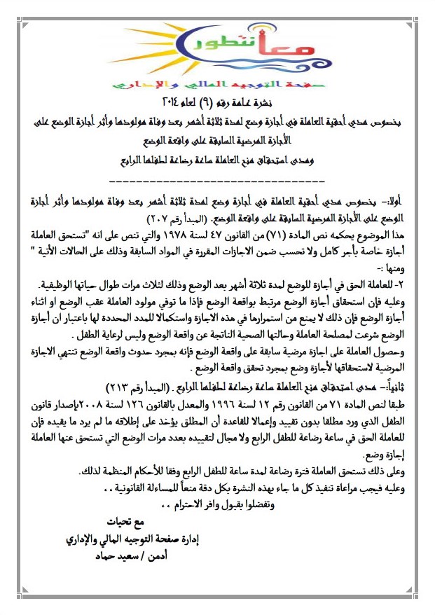 نشرة عــامة رقم (9) لعام 2014 بخصوص مدي أحقية العاملة في أجازة وضع لمدة ثلاثة أشهر