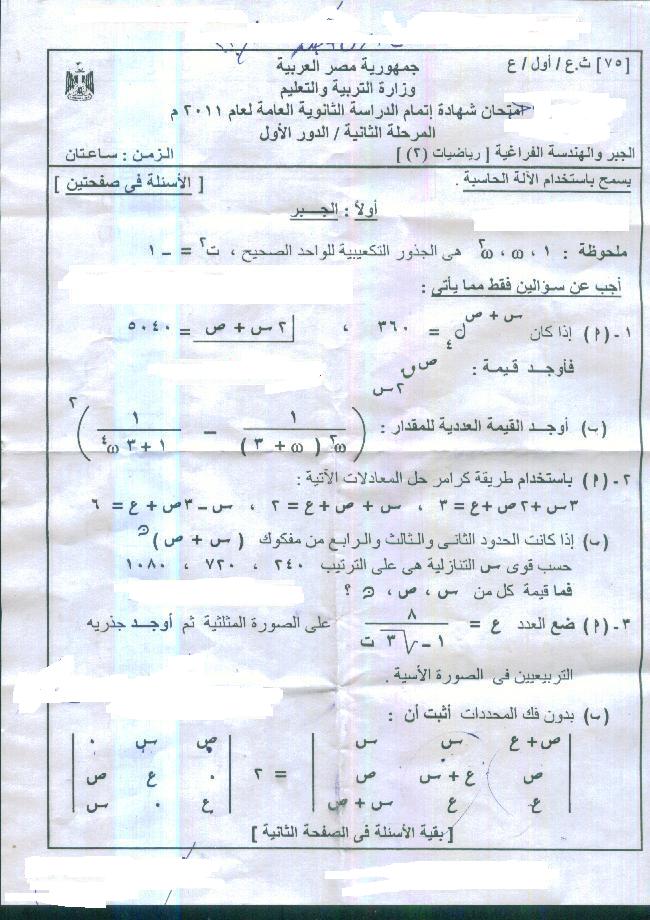 وإذا كان المشوار بعيد أتفضل السؤال الأول أ) س=1 ، ص=5 ب)-27/49 السؤال الثانى أ) س= 1 ، ص= -1 ، ع = 2 ب) س= 2 ، ص=3 ، ن =5 السؤال الثالث أ) ع = 4(جتا 60+ت جا 60 ) الجذر الأول = 2 هـ أس ط/6 ت الجذر الثانى = 2 هـ اس 7ط/6 ت ب ) اثبات السؤال الرابع أ) 1- متوازيان 2- عمودى على ذلك المستقيم 3- عموديا على مستويهما 4- (5 جذر 3 سم) ب)اثبات السؤال الخامس (اثبات) السؤال السادس اولا )45 ثانيا)1/2 ثالثا ) اثبات |