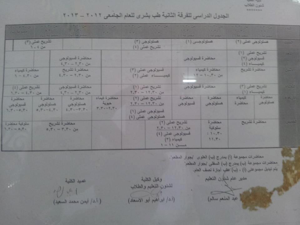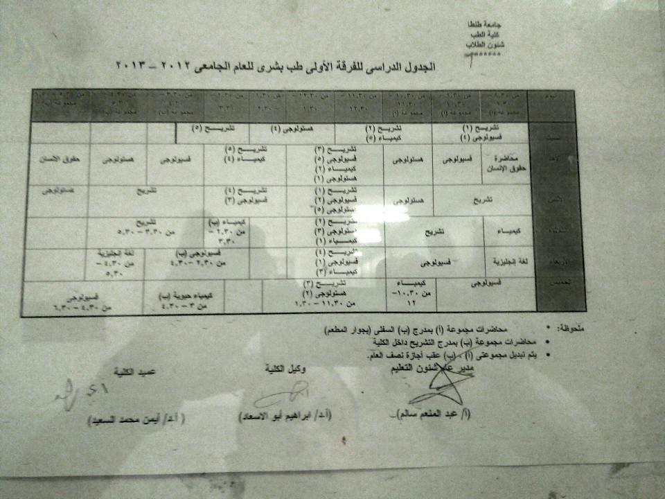 جدول محاضرات الفرقة الأولى و الفرقة الثانية طب طنطا