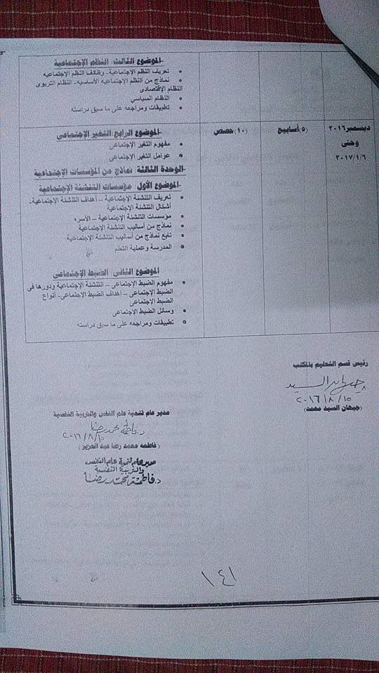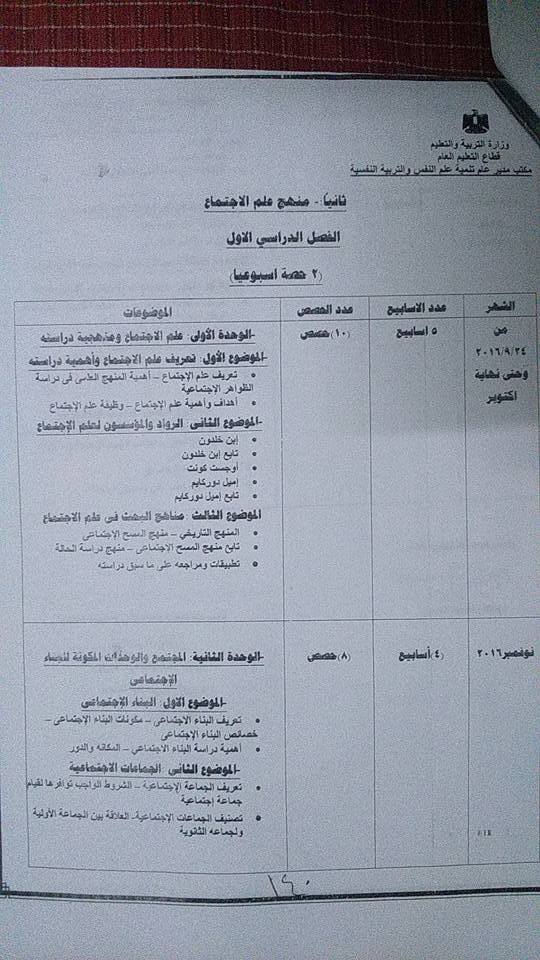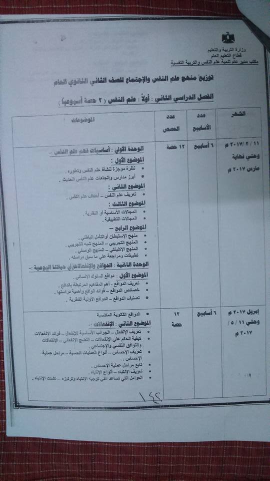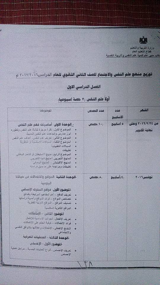 توزيع منهج علم النفس الصف الثانى والثالث للعام الدراسى 2016--2017