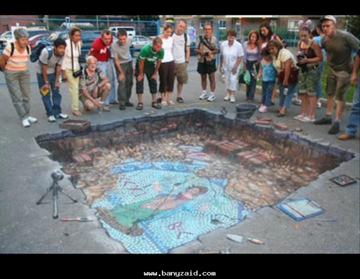 رسمها فنان بالبعد الثالث علي الأرض هي صور مستوية علي الأرض ولكن المارة ومن يشاهدها دائما وأبدا يتخيلها واقع ويخشي الوقوع بها حاول تركز واكتب تعليقك