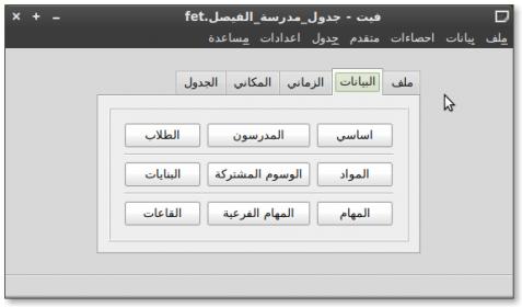 نبدأ ايها الاخوة الكرام في "دورة اعداد الجداول المدرسية باستخدام برنامج فيت fet" لمعرفة التفاصيل الرجاء الاطلاع على الموضوع التالي : تفضـــــــــــــل بداية نشغل برنامج فيت FET ومن القائمة الرئيسية نختار setting ومنها language ونختار اللغة العربية . اخي الكريم : اذا كان لديك سؤال في الجزئية السابقة فضلا اطرحه فورا (سيتم التوقف 60 ثانية للاسئلة).