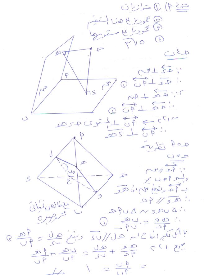 جضرتك انا المسألة الاخيرة فى الفراغية انا عملتها بنظرية 5 برضو الى هيا ان القطرين متعامدين وبيعملو زاوية زوجية 90 درجة يبقي المستوين متعامدين