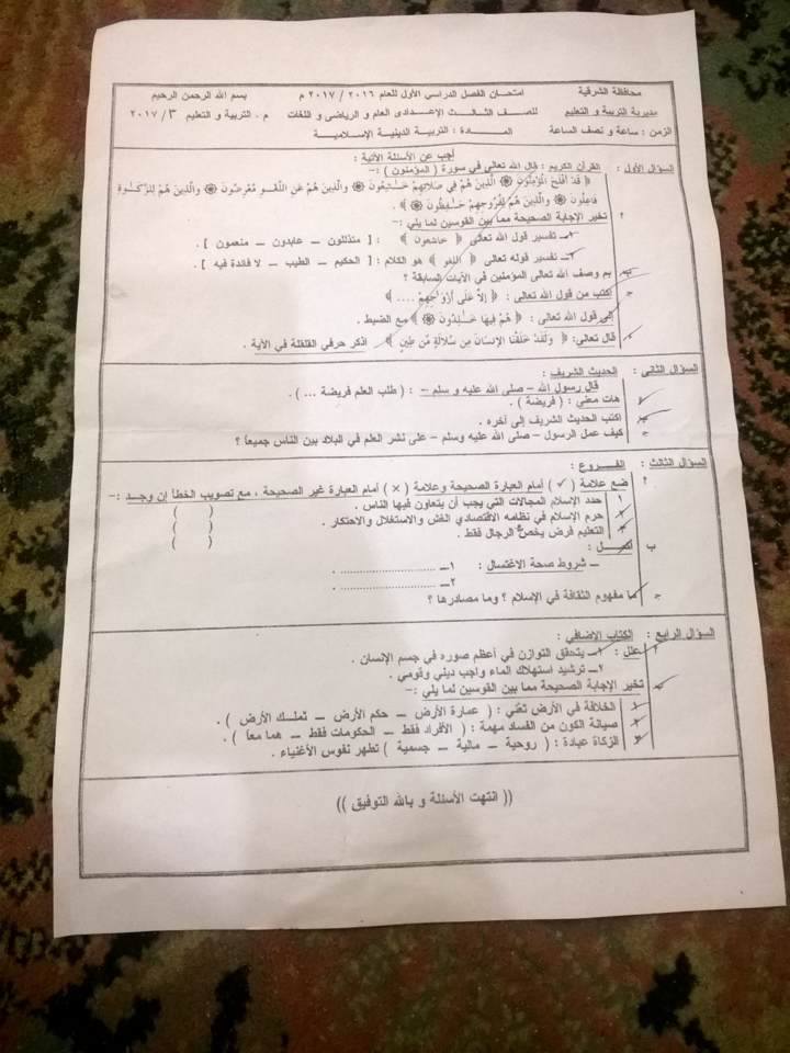 امتحان التربية الاسلامية محافظة الشرقية 2017
