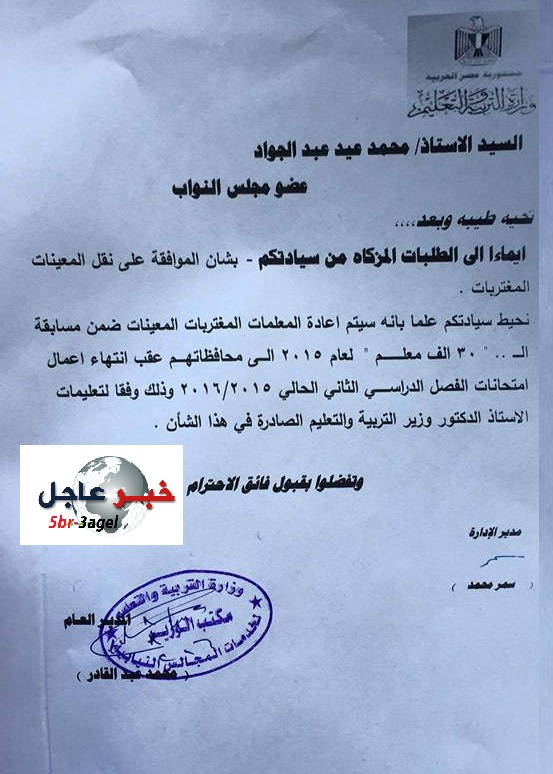 نائب ديروط موافقة السيد وزير التربية والتعليم على رجوع المعلمات المغتربات المعينات ضمن مسابقة الـ 30 الف معلم مساعد الي محافظاتهم الأصلية بعد امتحانات التيرم الثاني 2015-2016 جاء هذا بعد سعى المعلمين والمعلمات المسكنين فى محافظات بعيدة عن محل اقامتهم والمعينات بمسابقة ال 30 الف معلم العام السابق الى الرجوع لمحافظاتهم الاصلية . حيث تقدم النائب عبد الجواد للسيد وزير التربية والتعليم بطلب بشأن عودة المغتربات لمحل اقامتهم بعد حدوث الكثير من المشكلات نتيجة البعد عن محل الاقامة وجاءت الموافقة الرسمية بانه سيتم اعادة المعلمات المغتربات المعينات ضمن مسابقة ال 30 الف معلم لعام 2015 الى محافظاتهم وذلك بعد انتهاء اعمال الامتحانات للتيرم الثانى الحالى 2015 / 2016 وذلك بناءا على توجيهات السيد وزير التربية والتعليم __________________آخر تعديل بواسطة أبوبسملة ياسر خليفة الطحاوى ، 12-03-2016 الساعة 07:40 AM |