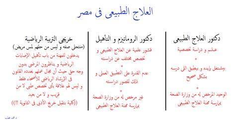 ![]() معا لتصحيح المفاهيم حول العلاج الطبيعى ![]() أكيد انت كطالب ثانوية عامة او كطالب لسه داخل علاج طبيعى سمعت كلام كتير عن العلاج الطبيعى مش عارف مرة انه تخسيس ومرة تانية انه اعشاب وتدليك ومرة ثالثة انه مش دكتور وعشان نوضح المعلومات الصح هنوضح اهم الأسألة فى السلسلة دى وفى سلسلة تانية هنشرح عن العلاج الطبيعى تفصيلا عشان الى عايز معلومات اكتر عن الكلية والمهنة هنتكلم هنا عن اشهر 5 معلومات غلط عن العلاج الطبيعى يلا نبدأ ![]() خدعونا_فقاااااااااااالوا (( الأكذوبة الأولى )) أخصائى_مش_دكتور !!!!!- طيب انت أكيد عمال تسأل هو خريج العلاج الطبيعى دكتور ولا اخصائى انا مش فاهم !!!!!!! - قصة_كلمة_أخصائى ![]() قلتلك عشان اجاوبك على السؤال دا .. محتاج اقولك ان فى حاجة اسمها التدرج الوظيفى ( مسمى وظيفى ) ؟! وهو كالتالى : 1-ممارس علاج طبيعى 2-اخصائى علاج طبيعى 3-اخصائى اول 4-كبير اخصائيين 5-استشارى ب و أ ( فى سجلات النقابة ) ودا مشابه الى حد ما للتدرج الوظيفى للبشرى .. قلتلك انت اول ما تتخرج من الكلية بتتخرج بلقب ممارس .. بعد 5 سنين من التخرج او لو انت حضرت رسالة الماجستير ( الماستر ) بيبقى اسمك اخصائى .. طيب لو انت فضلت 20 سنة بعد التخرج او 15 سنة بعد ما اخدت الماجستير .. او 10 سنين بعد ما اخدت الدكتوراه الفلسفية تاخد لقب استشارى .. والحاجات الى فاتت دى اسمها #المسمى_الوظيفى زى ما قلنا ودا معناه ان كلمة أخصائى دا حاجة زى الفل مش وحشة ولا حاجة زى ما احنا كنا فاكرين ![]() برده البشرى وهو متخرج اسمه ممارس عام وبعد الماجستير اسمه اخصائى وبيتدرج ويبقى استشارى مش قصة يعنى يبقى هو كدا أخصائى او ممارس ومش دكتور مثلا !!! وتقدر تشوف الكلام دا على اى يافطة لعيادة دكتور بشرى هتلاقى اسمه دكتور كذا اخصائى او استشارى مثلا امراض الجهاز الهضمى- طيب ايه قصة لقب_دكتور ؟!- لقب دكتور فى حد ذاته بتاخده بعد الدكتوراه الفلسفية PhD .. او انك تاخد DPT ويضاف #ليك اسم دكتور مهنى او اكلينيكى فبدل ما اسمك Physical Therapist يبقى اسمك Doctor of physical Therapy .. - المسمى_المهنى ( طبقا لاسم مهنتك ) : خريج هندسة : اسمه مهندس صح دا اسم مهنته ؟!انما انت أكيد سمعت بكلمة دكتور مهندس لأنه أخد دكتوراة PhD صح برده ؟! تمام كدا يبقى_نفرق بين : البشرى اسمه المهنى طبيب بشرى .. مسماه الوظيفى ممكن بقى ممارس عام او اخصائى او استشارى مثلا امراض النساء والتوليد او غيره . - طيب هو ليه بيقولوا لخريج البشرى والعلاج الطبيعى والبيطرى والأسنان والصيادلة يا دكاترة ؟! - العرف : العرف فى مصر ان خريج الكليات الطبية زى علاج طبيعى وبشرى واسنان وصيدلة وبيطرى وكدا الناس تقوله يا دكتور .. والعلاج الطبيعى ب4 أحكام محكمة كسبانهم العلاج الطبيعى يتقاله يا دكتور عرفا ![]() ------------------------------------------------------------------------------------------------ خدعونا_فقالوا (( الأكذوبة الثانية )) ![]() الروماتيزم_أو_التربية_الرياضية_ممكن_يشتغلوا_علاج _طبيعى !!!- طيب هنوضح بعض النقط المهمة : - العلاج_الطبيعى_باختصار Physical Therapy زى ما قلنا فى مواضيع قبل كدا : مجال كامل ليه وسائل علاج زى العلاج اليدوى و التمارين العلاجية و الوسائل الفيزيائية وغيرها .. ليه اقسام زى العظام - الأعصاب - الأطفال - الباطنة و الجهاز التنفسى و المسنين - الجراحة و الحروق و مشاكل زراعة و استئصال الأعضاء - نساء و توليد ... غير بقى التخصص فى الطب الرياضى و اصابات الملاعب غير اتكلمنا على دبلومات التغذية و كل الكلام الى قولنا عليه ؟! الروماتيزم_والتأهيل ( طب طبيعى سابقا ) - ايه هو الروماتيزم والتأهيل ؟! - الروماتيزم_و_التأهيل ؟! دا مجرد #تخصص من كلية الطب البشرى .. على عكس العلاج_الطبيعى مجال كامل زيه زى الطب البشرى و الأسنان و الصيدلة .. - التخصص دا يعتبر جزء من الباطنة .. هو تخصص بيتغير اسمه كتير الحقيقة مرة يقولك الطب الطبيعى .. مرة روماتيزم و تأهيل .. مرة طب طبيعى و روماتيزم و تأهيل - كل مجال الروماتيزم من اسمه دا المفروض انه يختص ب (( أمراض الروماتيزم و ما الى ذلك .. عن طريق تشخيص حالة و وصف دواء وبقيت الطرق المتاحة للب