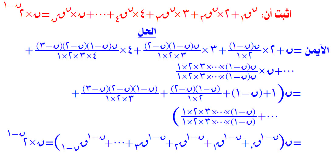 فى مفكوك (١+س) اس ن =ن ق ٠ +ن ق ١ س +ن ق ٢ س٢+...... بتفاضل الطرفين بالنسبة ل س ثم بالتعويض عن س =١ فى الطرفين ينتج المطلوب