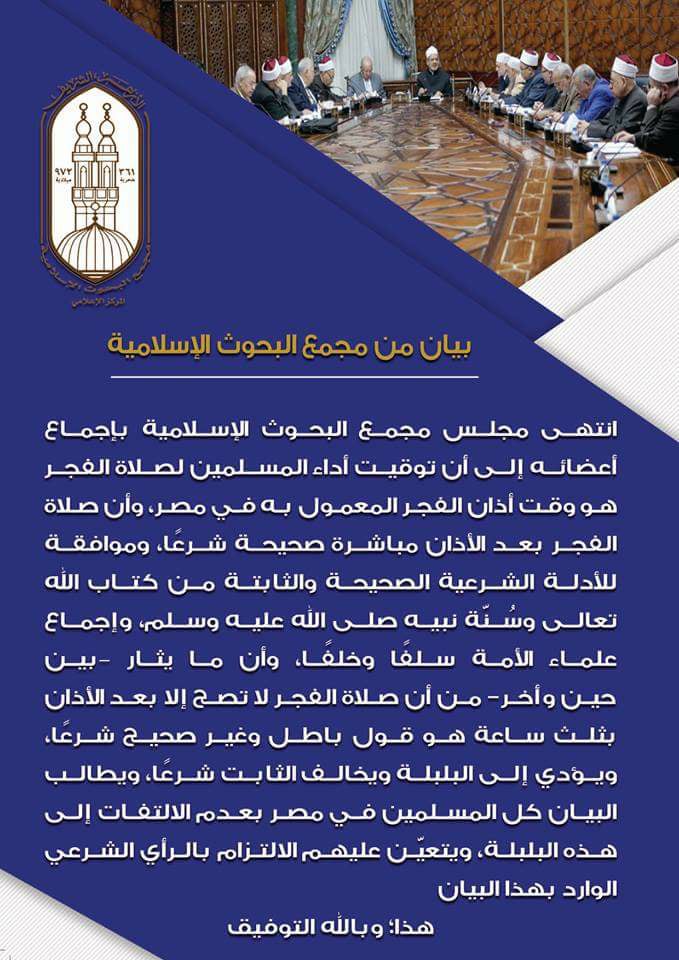 بيان مجمع البحوث الاسلامية بخصوص موعد آذان الفجر