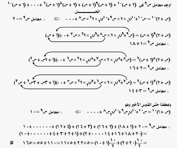 1) اثبت ان ((ن+1)(ن+2)×...............×2ن)على (1×3×5×..............×(2ن-1))تساوى2 ^ ن 2) بين ان الفرق بين معاملى (س ^ (ر+1) ) ، ( س ^ ر ) فى مفكوك (1+س)^(ن+1) يساوى الفرق بين معاملى (س ^ (ر+1) ) ، (س ^ (ر-1) ) فى مفكوك (1+س)^ن 3)اثبت ان الحد الوسط فى مفكوك (1+س)^2ن يساوى ((1×3×5×........×(2ن-1)) على (1×2×3×......×ن) ثم المقدار كله × 2س ^ن 4) اوجد معامل س^ 3 فى مفكوك (1+س+س^2)^6 5) فى مفكوك (1+م س)^ن اذا كانت نسبة معامل ح7 الى معامل ح5 هى 8 : 5 وقيمة معامل ح2 = 112 معامل ح1 اثبت ان ن = 8 ثم اوجد قيمة م 6) اذا كان أ = 5 ، ب = 20 فى مفكوك ( (أ+جذر(ب))^2ن ) + (أ - جذر ب ) ^ 2ن حيث أ ،ب،ن تنتمى ل ص+ ، ن عدد زوجى اثبت ان هذا المفكوك يقبل القسمه على 5 7) اوجد مفكوك ((س^4 +س^2 +1 ) على (س^2 + س +1 )) والمقدار كله + س ثم المقدار كاملا اس 6 8) اثبت ان معامل الحد الذى يشتمل على س^3 × ص^4 × ع^5 فى مفكوك (س + ص +ع)^ 12 هو (مضروب12) على (مضروب3 × مضروب4 × مضروب 5) 9) اوجد عدد الحدود التى قيمتها اعداد صحيح فى مفكوك (جذر3 + الجذر الرابع ل 5 )^ 124 10) اثبت ان (ن ق 0)^2 +(ن ق 1)^2 +........................+(ن ق ر)^2 يساوى مضروب 2ن على (مضروب ن )^2 11) اوجد معامل س^9 فى المقدار ((2+س)^10 +(2+س)^9 × (1+س) + (2+ٍس)^8 × (1+س)^2 +.................+(1+س)^10 ) |