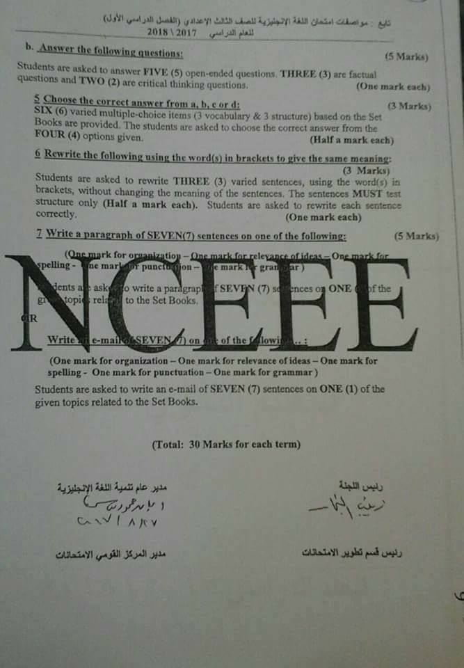 آخر مواصفات امتحان الصف الثالث الاعدادي 2017 - 2018