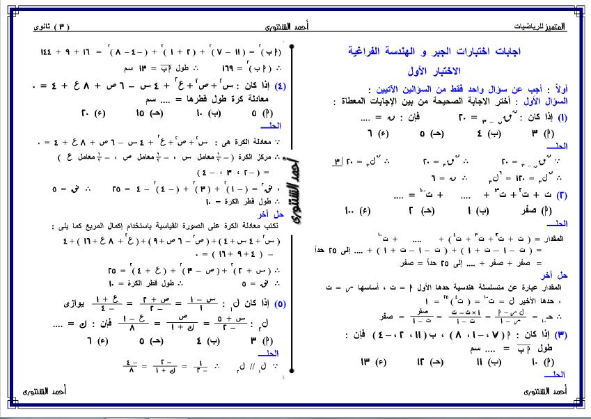 حلول إختبارات الكتاب المدرسى ( الجبر و الهندسة الفراغية _ 3 ث _ 2017 )