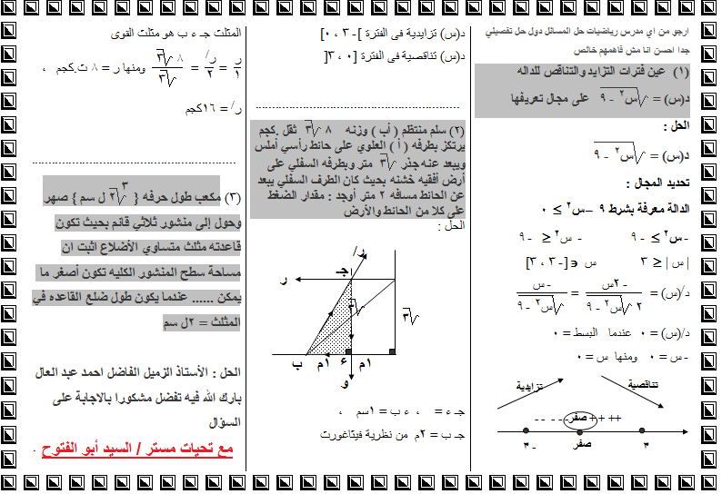 1.عين فترات التزايد والتناقص للداله د(س) = جذر ( 9- س2 ) على مجال تعريفها 2.مكعب طول حرفه } الجذر التكعيبي للعدد 2 ل سم { صهر وحول إلى منشور ثلاثي قائم بحيث تكون قاعدته مثلث متساوي الأضلاع اثبت ان مساحة سطح المنشور الكليه تكون أصغر ما يمكن ...... عندما يكون طول ضلع القاعده في المثلث = 2ل سم . 3.أوجد معادله المستقيم الذي يمر بالنقطه ( 2 ، 5 ) ويصنع مع محوري الإحداثيات مثلثا ذو أكبر مساحة. 4.سلم منتظم ( أب ) وزنه * 8 جذر 3 ثقل .كجم يرتكز بطرفه ( أ ) العلوي على حائط رأسي أملس ويبعد عنه جذر 3 متر وبطرفه السفلي على أرض أفقيه خشنه بحيث كان الطرف السفلي يبعد عن الحائط مسافه 2 متر أوجد : مقدار الضغط على كلا من الحائط والأرض . ياريت الحل ضروري جدا