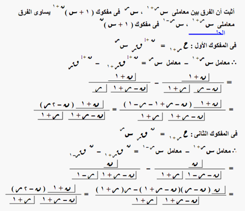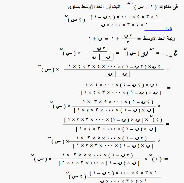 1) اثبت ان ((ن+1)(ن+2)×...............×2ن)على (1×3×5×..............×(2ن-1))تساوى2 ^ ن 2) بين ان الفرق بين معاملى (س ^ (ر+1) ) ، ( س ^ ر ) فى مفكوك (1+س)^(ن+1) يساوى الفرق بين معاملى (س ^ (ر+1) ) ، (س ^ (ر-1) ) فى مفكوك (1+س)^ن 3)اثبت ان الحد الوسط فى مفكوك (1+س)^2ن يساوى ((1×3×5×........×(2ن-1)) على (1×2×3×......×ن) ثم المقدار كله × 2س ^ن 4) اوجد معامل س^ 3 فى مفكوك (1+س+س^2)^6 5) فى مفكوك (1+م س)^ن اذا كانت نسبة معامل ح7 الى معامل ح5 هى 8 : 5 وقيمة معامل ح2 = 112 معامل ح1 اثبت ان ن = 8 ثم اوجد قيمة م 6) اذا كان أ = 5 ، ب = 20 فى مفكوك ( (أ+جذر(ب))^2ن ) + (أ - جذر ب ) ^ 2ن حيث أ ،ب،ن تنتمى ل ص+ ، ن عدد زوجى اثبت ان هذا المفكوك يقبل القسمه على 5 7) اوجد مفكوك ((س^4 +س^2 +1 ) على (س^2 + س +1 )) والمقدار كله + س ثم المقدار كاملا اس 6 8) اثبت ان معامل الحد الذى يشتمل على س^3 × ص^4 × ع^5 فى مفكوك (س + ص +ع)^ 12 هو (مضروب12) على (مضروب3 × مضروب4 × مضروب 5) 9) اوجد عدد الحدود التى قيمتها اعداد صحيح فى مفكوك (جذر3 + الجذر الرابع ل 5 )^ 124 10) اثبت ان (ن ق 0)^2 +(ن ق 1)^2 +........................+(ن ق ر)^2 يساوى مضروب 2ن على (مضروب ن )^2 11) اوجد معامل س^9 فى المقدار ((2+س)^10 +(2+س)^9 × (1+س) + (2+ٍس)^8 × (1+س)^2 +.................+(1+س)^10 ) |