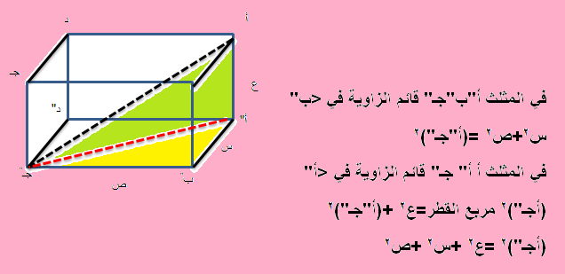 1- فى متوازى المستطيلات , اثبت ان مربع طول احد الاقطار يساوى مجموع مربعات اطوال ثلاثة احرف متقاطعة فى نقطة