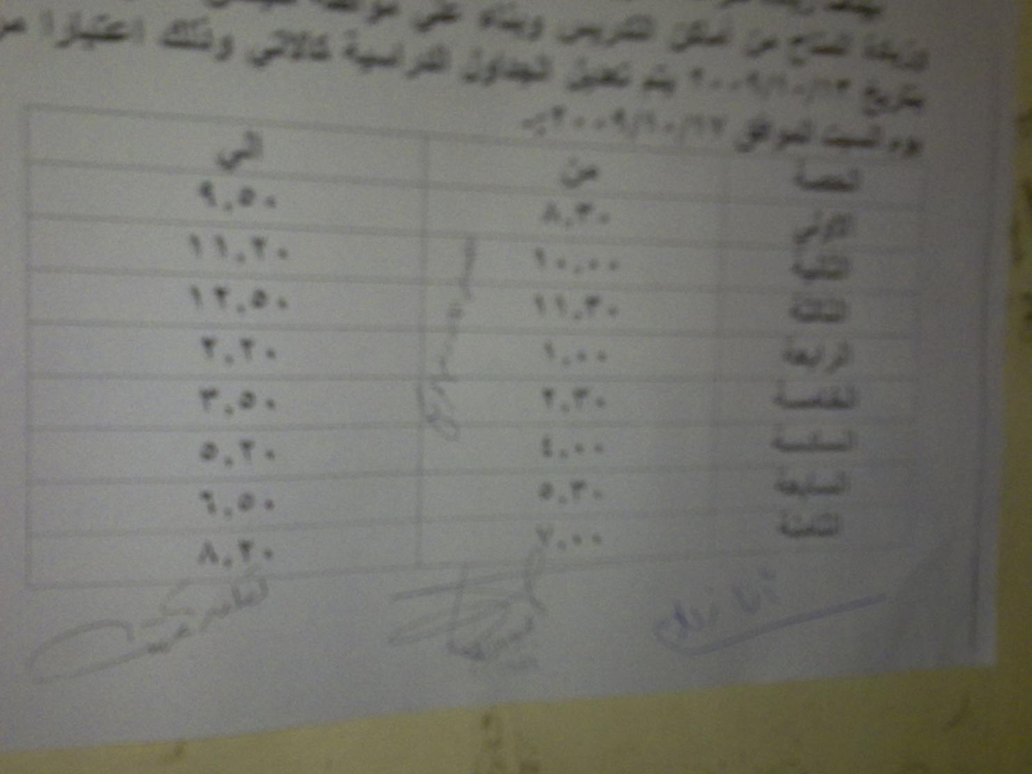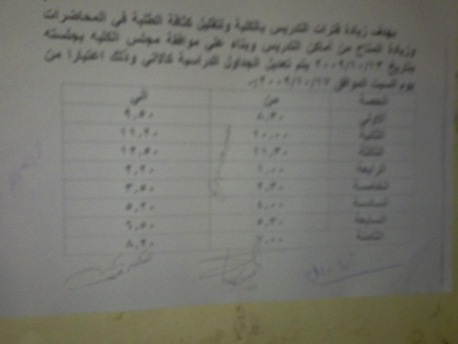 بهدف زيادة فترات التدريس بالكلية ولتقليل كثافة الطلبة فى المحاضرات وزيادة المتاح من اماكن التدريس وبناء على موافقة مجلس الكلية بجلستهبتاريخ 13-10-2009 تم تعديل الجداول الدراسية وذلك اعتبارا من السبت الموافق 17-10-2009