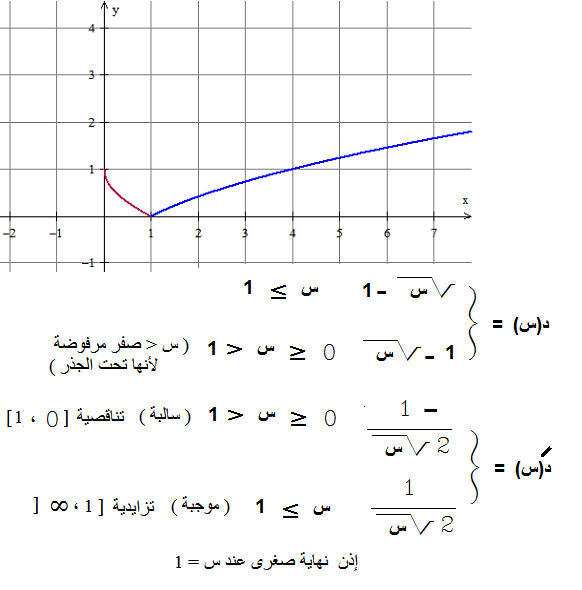 بالنسبة للحل السابق بعاليه ، الإجابة صحيحة بالنسبة للتزايد والتناقص ، ولكن لا توجد نقط حرجة حسب التعريف ، حيث يجب أن تنعدم المشتقة عندهذه النقط أى تساوى صفر ، وعند النقطة س = 1 الدالة غير قابلة للإشتقاق ، لأن المشتقة من اليمين =(0.5) ومن اليسار = ( ــ 0.5 ) [ وآسف للتعجل فى الرد السابق! ] .