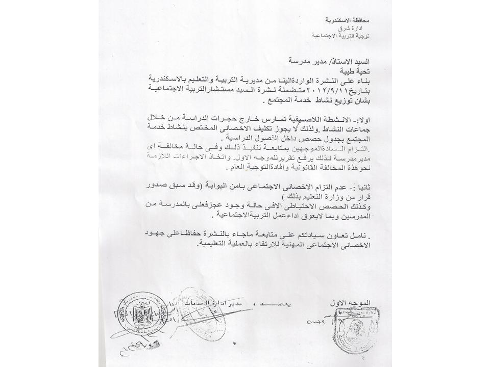 أرجو نقل النشرة الخاصة بعدم أسناد الحصص أو الامن للاخصائى وهى متواجده بالمشاركة السابقة لان أحيانا ومثل ما يحدث فى المجتمع من أنواع الاتفاقات خاصة أن كان بعض الزملاء يرغبون تخليص مصالحهم فلا يعترضون