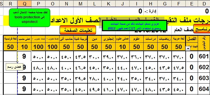 في البداية احب اشكرك علي الشيت العظيم دة من هذة الأخطاء احصاء الادارة في الفصل الدراسي الأول في جملة المتقدمين المفروض انه بيجمع البنون + البنات لكن للأسف بيديني عدد البنين فقط ثانيا لا حظت الآتي 1- الشيت مش مرتب بترتيب شيت الوزارة ودة هيسبب مشا كل وخاصة في الادارة العقيمة اللي عندنا 2- لا يوجد في حالة القيد اختيار منازل لمنع احتساب الطالب المنازل في الاحصاء 3- هناك بعض الاخطاء التي تحتاج الي تصليح ولكن للأسف الشيت محمي بكلمة سر غير كلمة الحمد لله ودا بيخليني مش عارف اعدلها وياريت رقم موبايل حضرتك للتواصل عند مواجهه اي مشكلة من اي نوع - 2- تحاول تعدل الشيت علي اساس ترتيب شيت الوزارة ودة مش هيكلف حضرتك حاجة أو تنشر كلة سر الصفحات المحمية لو ممكن بس علي ما اعتقد انه صعب شوية |