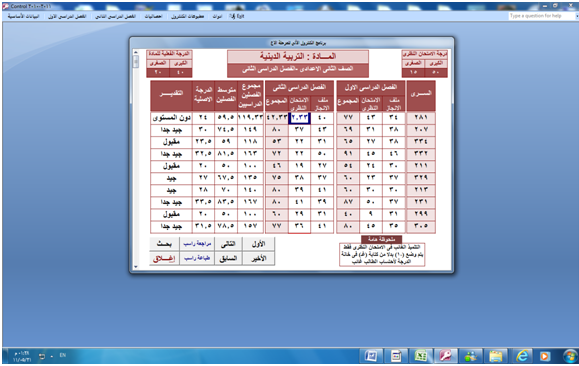 الاخ العزيز جميع مواد الرسوب تظهر فى خانة حالة الطالب ولكن المشكلة ان خانة حالة الطالب او الملاحظات عرضها لا يزيد عن 3 سم وبالتالى فى حالة الطالب المنقطع لا تتسع لتشمل كل المواد حاول تنزيل اخر نسخة للبرنامج وستجد انى اختصرت اسماء المواد لكى تتسع اكتر ولكن المشكلة لا زالت قائمة ولا يوجد لها حل عندى سوى تصغير الخط ولو عندك اقتراح مفيد انا انفذه فوراً من عينيا بالنسبة لنسب النجاح اللى ظاهر عندى اما انك لم ترصد الترم الثانى حتى الان او ان جميع الطلاب راسبين برجاء ارفاق صورة من البرنامج وبها البيانات على الايميل حتى اتمكن من رؤوية العيب بوضوح وعموما سوف اعيد صياغة جميع الاحصائيات ثانية ولكن بعد انتهاء اعمال الامتحانات لانى مشغول جدا جدا وبحاول فى الوقت الحاضر نظراً لضيق الوقت تعديل الحاجات السريعة التى يتوقف عليها عمل البرنامج وياريت لو عندك متسع من الوقت اكتبلى اسماء الاحصائيات التى بها اخطاء مع تحديد شكل الخطاً بالصور كما فعلت حتى اتمكن من التصحيح السريع وشكراً لك شكل نفس الاحصائية من نسخة البرنامج التى عندى ولم يظهر بها هذا العيب |