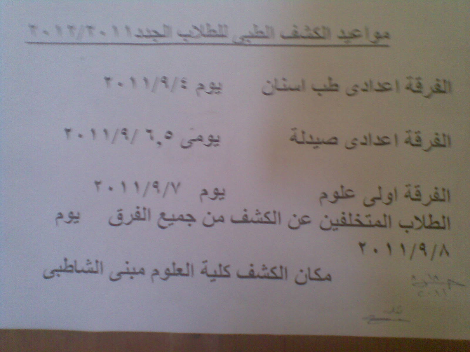 . . . . قالولى ان التقديم غالبا هيكون بعد العيد ومش هيتاخر عن كدة ده لو مكنش قبل كدة وتم تحديد ميعاد الكشف الطبى لطلبة لفرقة الاولى علوم يوم 7-9-2011 وطبعا معنديش اى معلومات عن الكشف ده وانا صورتلكم الاعلانات دددددى فى المرفقات وياريت اللى عنده معلومات عن الشكف الطبى يفيدنا بيها وهل هو خاص بالكلية ولا بيتعمل فى مكان برة ؟؟؟