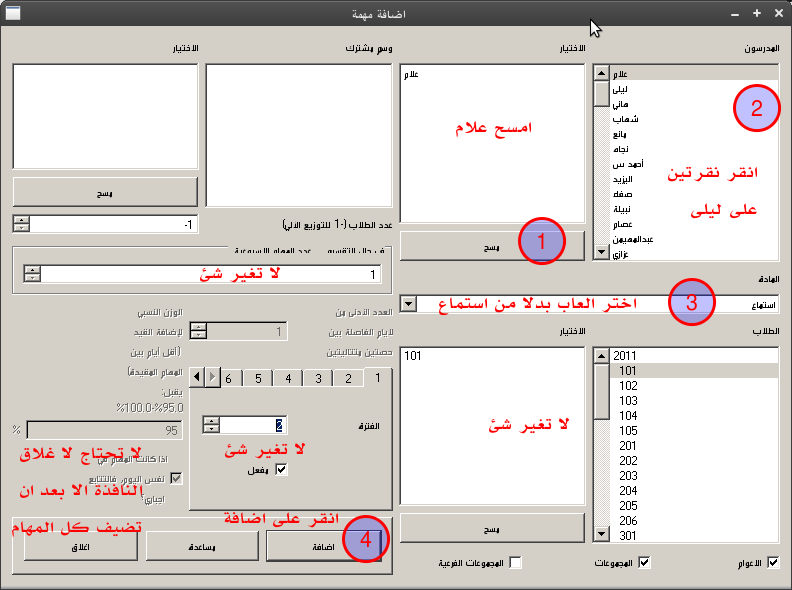 ملاحظة مهمة : من الاسهل ادخال البيانات : - في المرحلة الاعلى من الابتدائية : حسب مهام المدرس ، بمعنى ادخال جميع حصص المدرس "علام" ، ثم جميع حصص المدرسة "ليلى" وهكذا. ويظهر اثر هذه الطريقة (من ناحية السهولة) بشكل واضح في المراحل الدراسية الاعلى من الابتدائية ، ﻻن حصصها اكبر من حصتين في الاسبوع. - في المرحلة الابتدائية : حسب المادة.