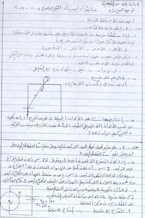 الاحمر يقل لان السائل يوثر على الثقل بقوة دفع لاعلى فيصيح وزن الثقل هو الوزن الظاهرى فتقل قوة الشد فى الخيط فيقل التردد 3- هاتمد العمود المرسوم على الوجه الذى يدخل منه الضوء والذى يخرج منه الضوء فتكون زاوية السقوط الثانية 90- سيتا وتعمل معدلتين وتجيب معامل الانكسار 4 / وذلك عند سقوط الضوء الابيض الذى يتكون من سبعة ألوان ذات أطوال موجية مختلفة فيكون لها معاملات انكسار مختلفة فيكون لها زوايا أنكسار مختلفة فيظهر قوس قزح