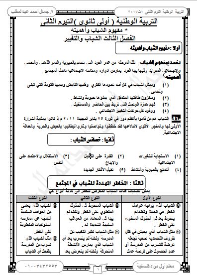 مذكرة الجمال فى التربية الوطنية الصف الاول الثانوى الفصل الدراسى الثانى 2017 خالصة لوجه الله اسال الله ان ينفعنا واياكم بها ان شاء الله