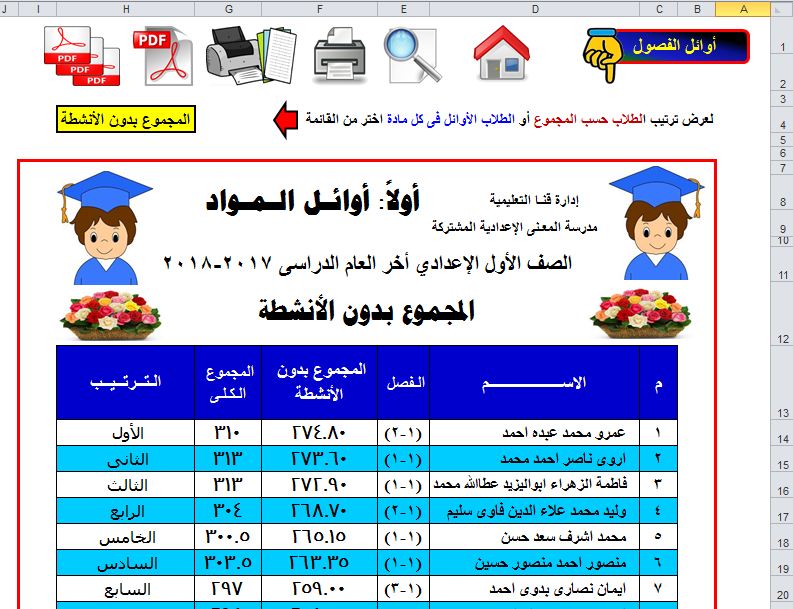 7- الطلاب الأوائل في كل مادة والطلاب الأوائل لكل فصل ، في نصف العام وأخر لعام.