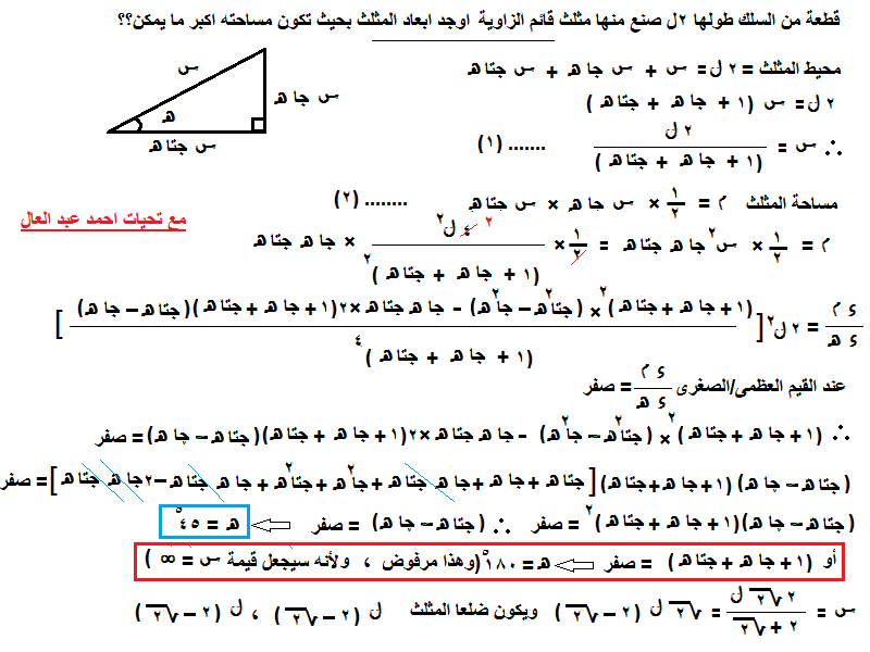 اوجد ابعاد المثلث بحيث تكون مساحته اكبر ما يمكن؟؟ |