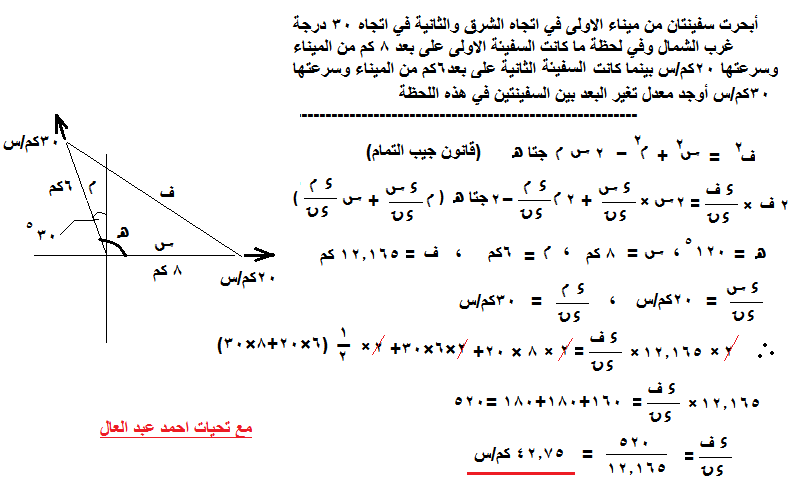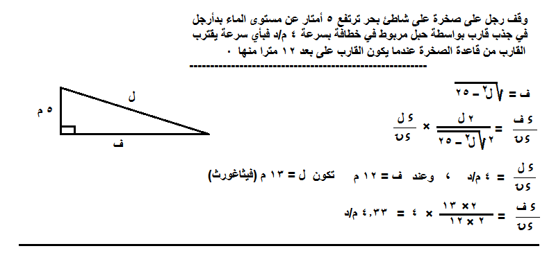 وقف رجل على صخرة على شاطئ بحر ترتفع 5 أمتار عن مستوى الماء بدأرجل في جذب قارب بواسطة حبل مربوط في خطافة بسرعة 4 م/د فبأي سرعة يقترب القارب من قاعدة الصخرة عندما يكون القارب على بعد 12 مترا منها . --------------------------------------------------------- أبحرت سفينتان من ميناء الاولى في اتجاه الشرق والثانية في اتجاه 30 درجة غرب الشمال وفي لحظة ما كانت الشفيتة الاولى على بعد 8 كم من الميناء وسرعتها 20كم/س بينما كانت الصفينة الثانية على بعد6كم من الميناء وسرعتها 30كم/س أوجد معدل تغير البعد بين السفينتين في هذه اللحظة . ------------------------------------------------------ :bosyht9::bosyht9: |