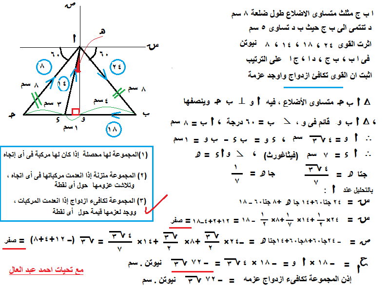 د تنتمى الى ب ج حيث ب د تساوى 5 سم اثرت القوى ....24 ....18 .... 14... 8.... نيوتن فى ا ب... ب ج... د ا... ج ا على الترتيب اثبت ان القوى تكافئ ازدواج واوجد عزمة |