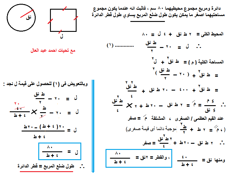(1)اثبت ان : م ا =م ب =م ج =م د =20 سم (2)اذا كان ك , ن منتصفى م ا , م د , فاثبت ان الشكل ب ك ن ج مستطيل . احسب طول قطره ومساحة سطحه . |