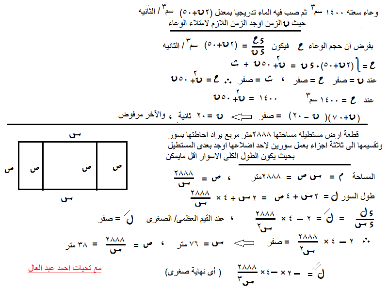 وعاء سعته 1400سم مكعب ثم صب فيه الماء تدريجيا بمعدل (2ن +50)سم مكعب على الثانيه حيث ن الزمن اوجد الزمن اللازم لامتلاء الوعاء (نطبيقات على القيم الصغرى والعظمى) قطعة ارض مستطيله مساحتها 2888متر مربع يراد احاطتها بسور وتقسيمها الى ثلاثة اجزاء بعمل سورين لاحد اضلاعها اوجد بعدى المستطيل بحيث يكون الطول الكلى الاسوار اقل مايمكن |