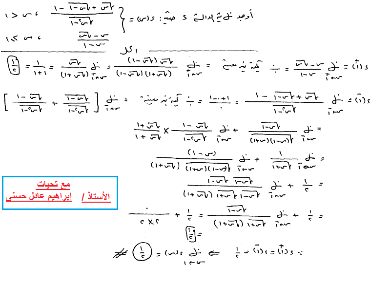 معاكى حق يا ساره ، النهاية ليست واحدة من الجهتين فإحداهما ( 1 ÷ 2 ) ، والأخرى [ 1 ÷ جذر(2) ] وعليه فالنهاية ليس لها وجود عند س = 1 ، اعتذر نيابة عن الأستاذ / ابراهيم عادل وإن كان هذا لا يقلل من روعة حله احمد عبد العال |