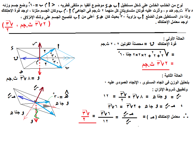 وضع جسم وزنه 16 نيوتن علي مستوي مائا خشن ولوحظ ان الجسم اصبح علي وشك الحركة لاسفل المستوي تحت تاثير وزنه فقط عندما كان المستوي يميل غلي الفقي بزاوية جيبها 3علي 5 اوجد معامل الاحتكاك بين الجسم والمستوي وكذلك زاوية الاحتكاك
