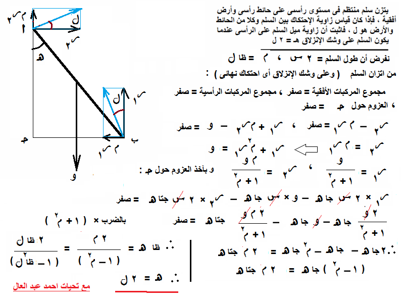 يمر خيط خفيف على بكرة ملساء مثبتة رأسيا يحمل فى إحدى طرفية كفة ميزان زنبركى (يمكن إهمال وزنة )بها كتلة ك1 وبالطرف الآخر كتلة ك2 إذا أمسكنا بالخيط عند البكرة .............الخ باقى المسألة سليم ويكون الحل عند إمساك الخيط تكون قراءة الميزان = وزن الكتلة ك1 = 200 ث جم ( ر= ك1د ) أى أن ك1 = 200 جرام حالة سكون عند حركة المجموعة ر = 300 ث جم أكبر من ك1د فتكون الحركة لأعلى بالنسبة للكتلة ك1 ويكون ش = ر ( 300 ث جم ) بسبب إهمال وزن الميزان وتكون معادلة الحركة هى ش - ك1د = ك1ج نحصل على ج = 490 سم/ث2 ثم معادلة الجسم الآخر ك2د - ش = ك2 ج نحصل على ك2= 600جم مع خالص دعائى بالتوفيق |