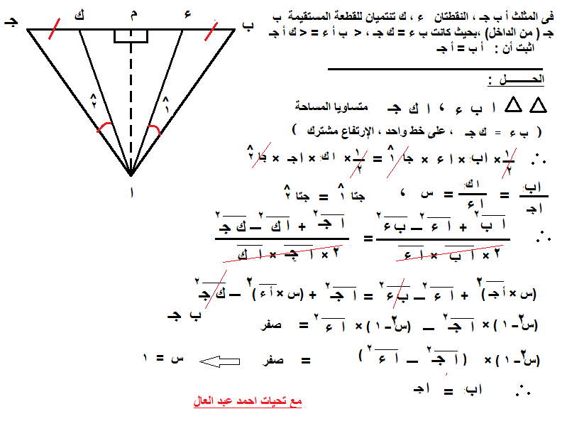 وبعدها نستخدم قانون جيب التمام ... هذا حل ، وممكن ننصف زاوية ب أ جـ فيقابل ب جـ فى ن مثلا ونستخدم تساوى النسب أ ب : أ جـ = ب ن : ن جـ ( ب ن = ب ء + ء ن ، ن جـ = ن ك + ك جـ ،ب ء = ك جـ )وهكذا ... الملف المرفق 86014 |