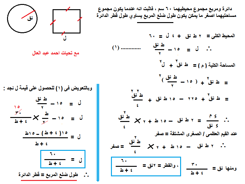 دائرة ومربع مجموع محيطيهما 60 سم , فاثبت انه عندما يكون مجموع مساحتيهما اصغر ما يمكن يكون طول ضلع المربع يساوي طول قطر الدائرة