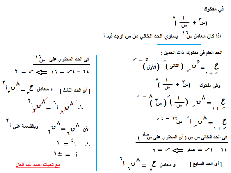 في مفكوك (س3+أ/س)8 اذا كان معامل س16 يساوي الحد الخالي من س اوجد قيم أ