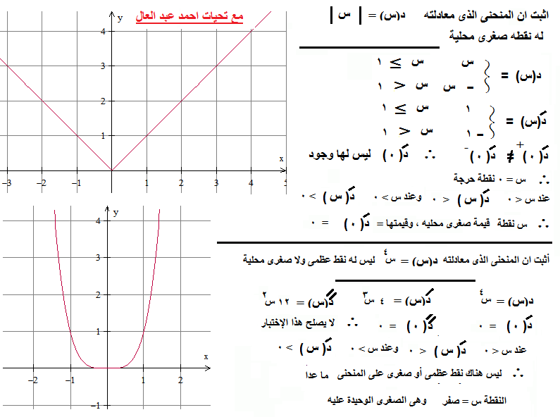 د ( س ) = مقياس ( الجذر التربيى لـ س - 1 ) 2 - أثبت ان المنحنى الذى معادلته س ( اس 4 ) ليس له نقط عظمى ولا صغرى محلية .. 3- اثبت ان المنحنى الذى معادلته (( مقياس س )) له نقطه صغرى محلية .. وجزاكم الله كل خير |