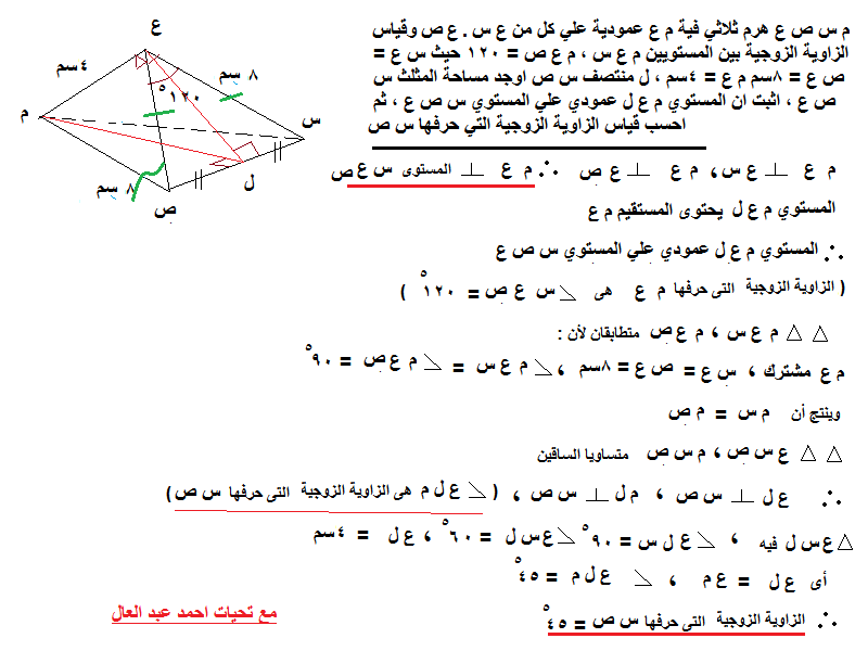 م س ص ع هرم ثلاثي فية م ع عمودية علي كل من ع س . ع ص وقياس الزاوية الزوجية بين المستويين م ع س , م ع ص = 120 حيث س ع = ص ع = 8سم م ع = 4سم , ل منتصف س ص اوجد مساحة المثلث س ص ع , اثبت ان المستوي م ع ل عمودي علي المستوي س ص ع , ثم احسب قياس الزاوية الزوجية التي حرفها س ص