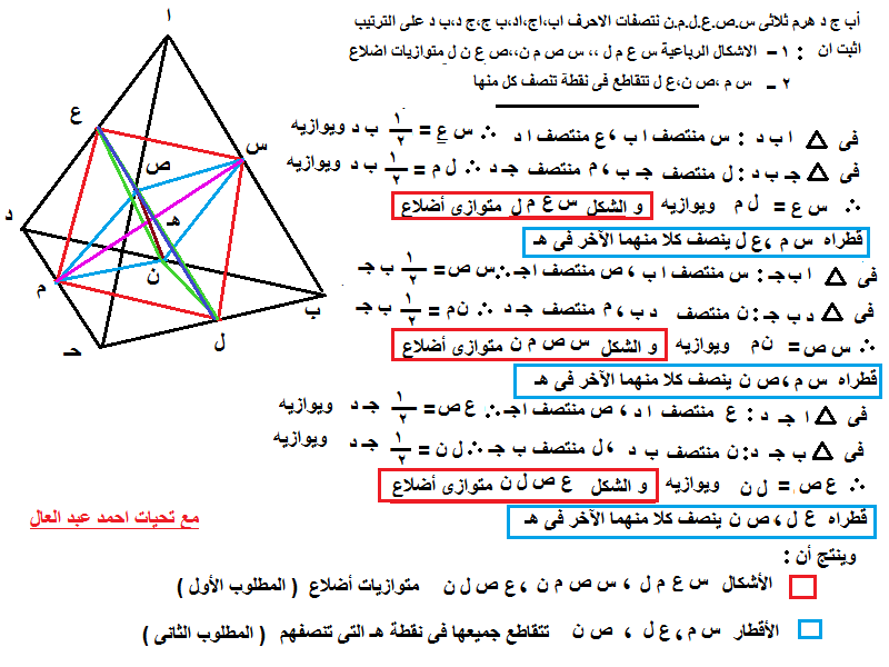 إليك حل المسألة الأولى الملف المرفق 79274 وبالنسبة للمسألة التانية فكرتها قريبة من فكرة المسألة الأولى ، مع الإستفادة من إن منصف ضلعين فى مثلث يوازى الثالث ويساوى نصفه |