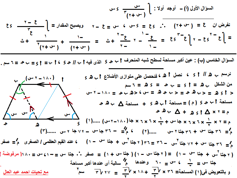نتهز الفرصة للدعاء لأستاذنا أن يمتعه بوافر الصحة وكامل السعادة وأن يجزل له جزاء ما قدم ، وأستأذنه فى تقيم رؤية أخرى للسؤال الأول (أ) ، والسؤال الخامس (ب) الملف المرفق 82176 |