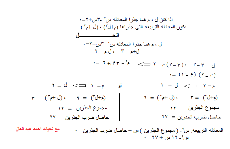 المسأله تأليف الاستاذ محمد عبد الرحمن اذا كان ل و م هما جذرا المعادله س تربيع_3س+2 فكون المعادله التربيعه التى جذراها م+ل تكعيب ول +م تكعيب |
