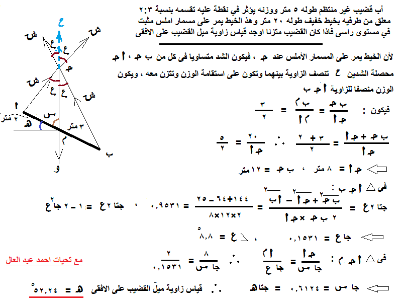 أب قضيب غير منتظم طوله 5 متر ووزنه يؤثر في نقطة عليه تقسمه بنسبة 2:3 معلق من طرفيه بخيط خفيف طوله 20 متر وهذ الخيط يمر على مسمار املس مثبت في مستوى راسى فاذا كان القضيب متزنا اوجد قياس زاوية ميل القضيب على الافقى