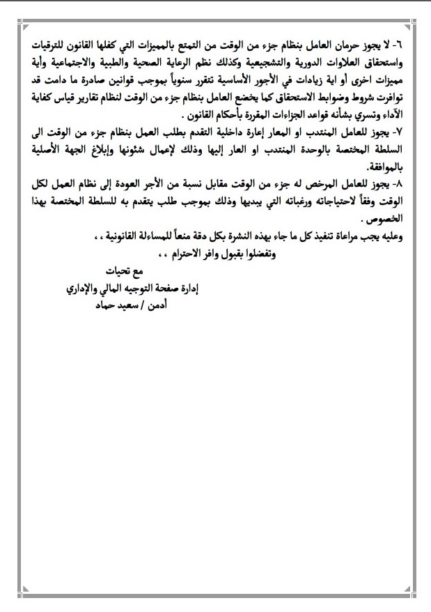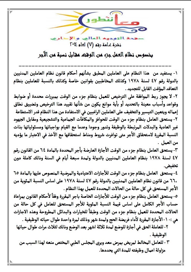 نشرة عــامة رقم (7) لعام 2014 بخصوص نظام العمل جزء من الوقت مقابل نسبة من الآجر