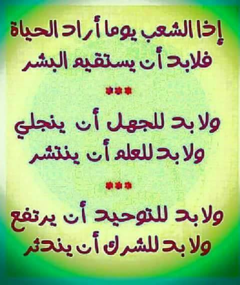 إذا الشـــعبُ يومًــا أراد الحيــاة * فــلا بــدّ أن يســتجيب القــدرْ. ولا بــــدَّ لليـــل أن ينجـــلي * ولا بــــدّ للقيـــد أن ينكســـرْ. في انتظار إبداع جديد |