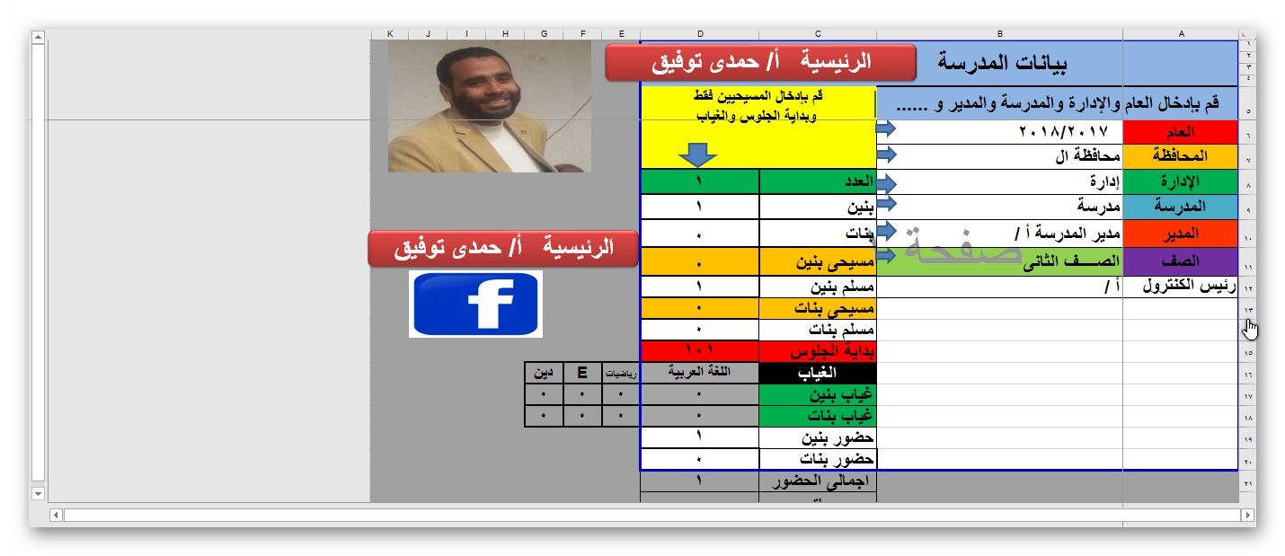 برنامج الكنتر ول المدرسى للمرحلة الابتدائية إعداد أ / حمـــــــدى توفيق 1-لابد من تفعيل الماكرو (micro) أولا أو تفعيل المحتوى من الشريط الأصفر أعلى الصفحة 2-افتح الأسماء وانقل الأسماء إليها بالنسخ أو الكتابة وأدخل النوع وحالة القيد 3-افتح بيانات المدرسة وأدخل البيانات المطلوبة من * العام و*المحافظة و*الإدارة و*المدرسة و*المدير و*الصف و*رئيس الكنترول و*بداية الجلوس و*أعداد المسيحيين من البنين والبنات و*الغياب للبنين والبنات فقط 4-ارجع للأسماء وأدخل الرقم السرى ( يدويا ) حسب أرقام الجلوس ( كل واحد حسب اعداد الأرقام السرية الخاصة بالكنترول ) ملحوظة بمجرد ادخال الأسماء والنوع سيتم عمل إحصائية بالبنين والبنات والتلاميذ الباقين 5-البرنامج سيقوم باعداد كشوف العملى والاختبارات الشفهية واللجان مع ضرورة تحديد اللجان يدويا 6-أدخل درجات النشاط ودرجات نصف العام 7-سيقوم البرنامج بعمل اللازم من استخراج الشهادات والنسبة والاحصاء ونسبة 65 % والأوائل و إضافة الترتيب في الشهادة ومواد الضعف للتلاميذ الضعاف في نصف العام والتلاميذ الضعاف وكشوف تقديرات ودرجات 8-يمكنك البحث في الشهادات حسب الاسم أو حسب رقم الجلوس 9-يمكنك طباعة شهادات تقدير للأوائل في نهاية العام 1-أدخل نشاط 2 2- أدخل امتحان نهاية العام 3- سيقوم البرنامج أيضا بعمل اللازم كما تم في نصف العام بالضبط مع استخراج شهادات الناجحين ملحوظة عند طباعة الشهادات ستظهر شهادات الراسبين باللون الأسود 4-يجب نسخ أسماء الراسبين ورقم جلوسهم ومواد الرسوب ونسخها في شيت الراسبين لاستخراج شهادات الراسبين 5-سيقوم البرنامج بعمل اللازم من استخراج الشهادات والنسبة والاحصاء ونسبة 65 % والأوائل و إضافة الترتيب في الشهادة ومواد الضعف للتلاميذ الضعاف في نهاية العام والتلاميذ الضعاف وكشوف تقديرات ودرجات 6-يمكنك البحث في الشهادات حسب الاسم أو حسب رقم الجلوس 7-يمكنك طباعة شهادات تقدير للأوائل 8-شيت لدرجات الدور الثانى وشهادات الدور الثانى |